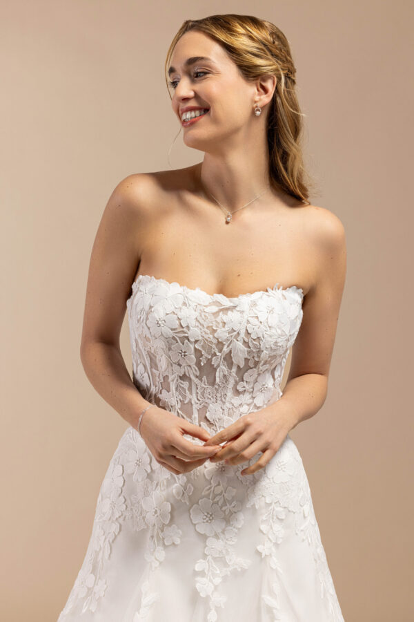Pour celles qui rêvent d’une robe sirène, cette pièce sublime les hanches tout en offrant plus de liberté au niveau des cuisses, ce qui la rend idéale pour toutes les morphologies, y compris les grandes tailles. Son bustier à l’esprit lingerie, orné de dentelle délicate enrichie de sequins, apporte une touche de féminité et de glamour. Le tissu d’aspect mat, épuré et frais, équilibre parfaitement la sensualité du design, offrant une allure moderne et raffinée.
