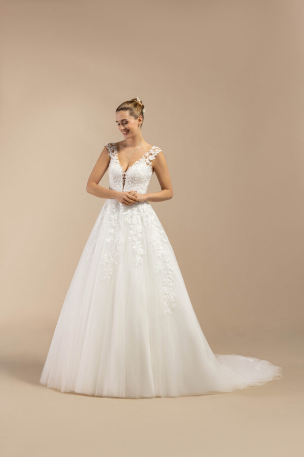 Cette robe de mariée florale séduit par son bustier cœur, orné de bretelles en dentelle finement rehaussée de sequins, ajoutant une touche de brillance subtile. Le dos, entièrement habillé de dentelle, dévoile une élégance toute en finesse. Tandis que la jupe grâce a la tulle apporte du volume, créant une silhouette aérienne et romantique. Une robe qui allie douceur, éclat et féminité pour une mariée tout simplement ravissante.