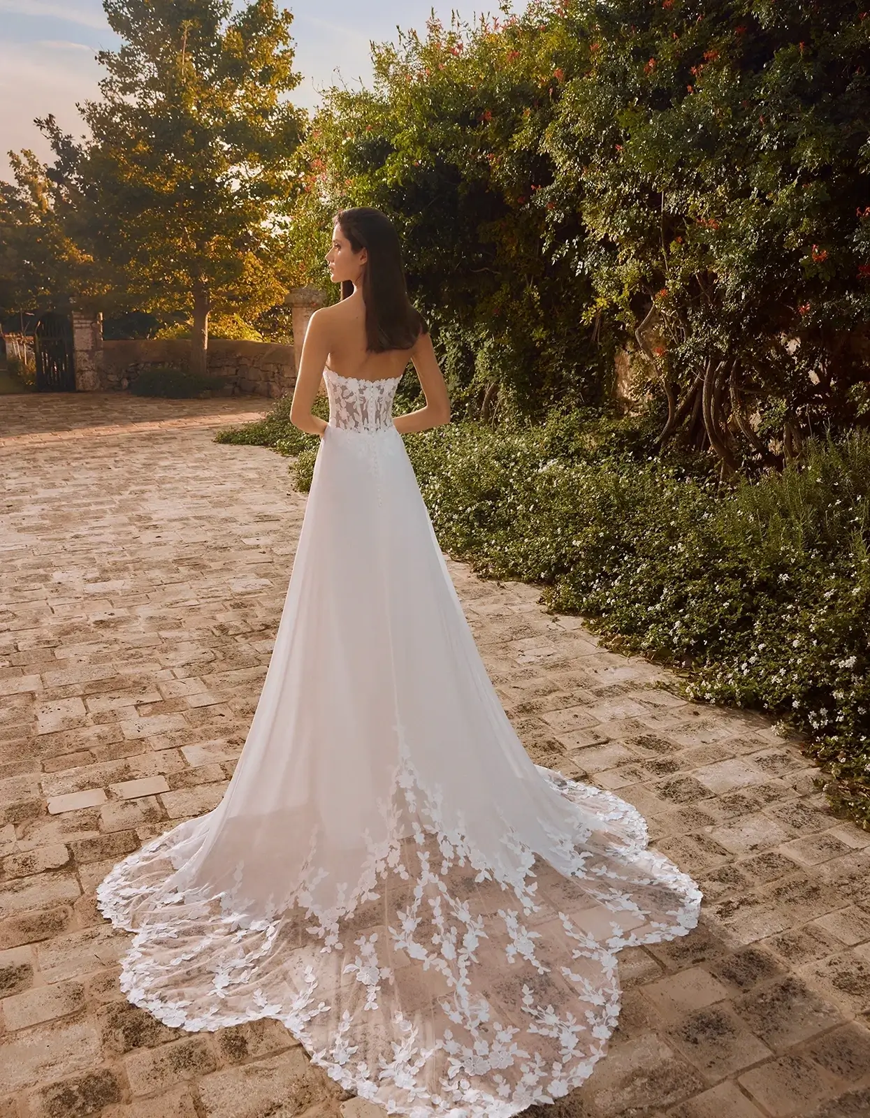 Cette robe de mariée trapèze de style romantique allie un corsage corset en dentelle délicate à une jupe fluide en mousseline, créant une silhouette à la fois élégante et féminine. La traîne en dentelle ajoute une touche de majesté, tandis que la veste en dentelle amovible à manches longues permet de jouer avec un look à la fois classique et moderne. Le résultat est une robe versatile qui offre un effet « double look », parfait pour s’adapter aux différentes étapes de la cérémonie.