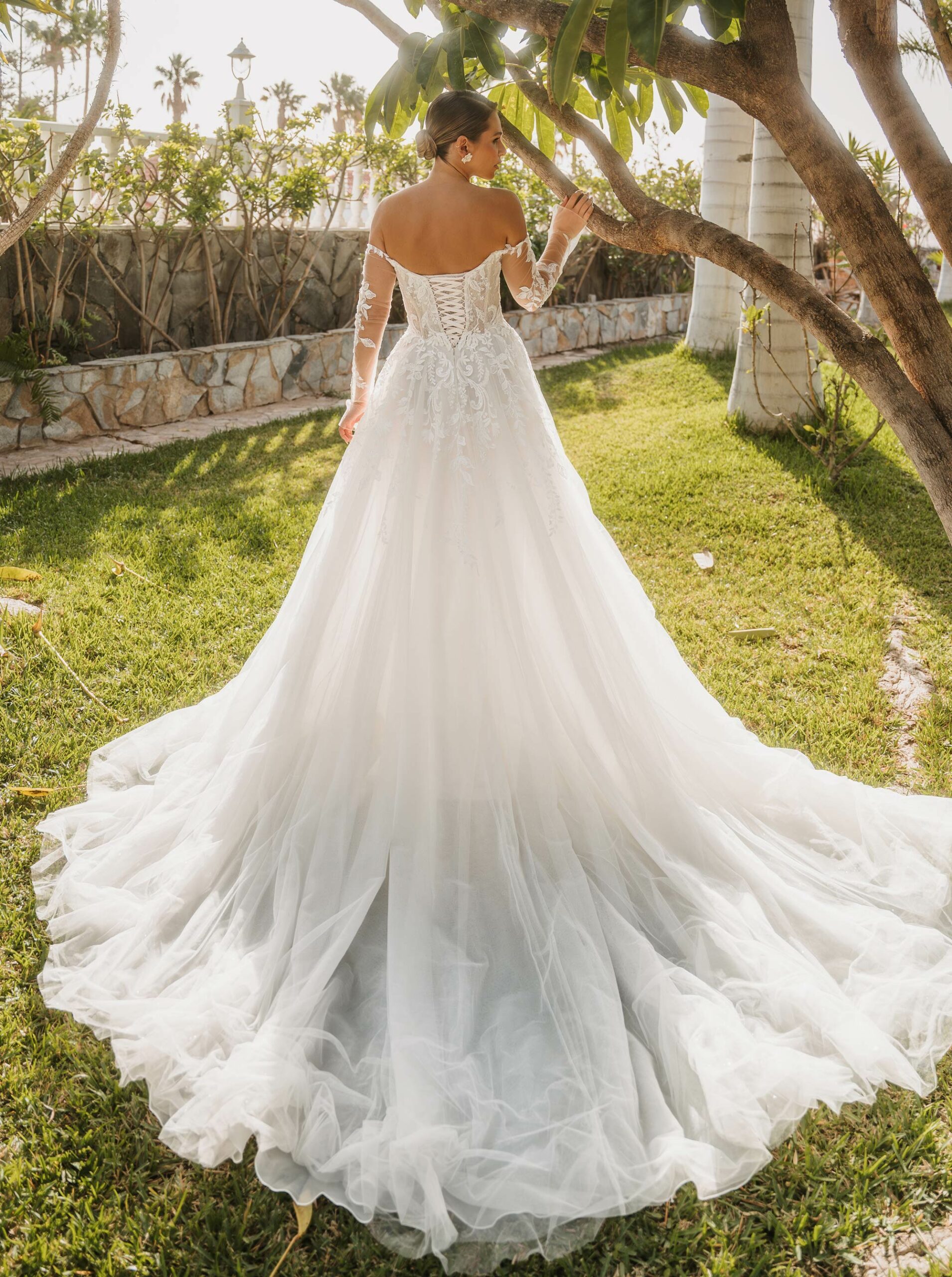 Une robe de rêve en dentelle botanique, mettant en valeur un décolleté romantique en cœur et des manches épaules dénudées qui ajoutent une touche de sensualité. De fins détails dans le dos et une dentelle fluide à la taille se fondent parfaitement dans une jupe en tulle vaporeuse, créant une silhouette légère et élégante. La traîne en dentelle complète l’ensemble avec raffinement, pour une allure à couper le souffle, comme sortie d’un conte de fées.