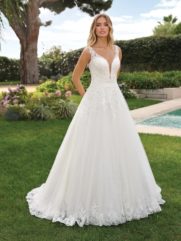 Resplendissez dans la robe princesse EROS en tulle, conçue pour capturer les cœurs avec son décolleté en V et sa dentelle délicate.