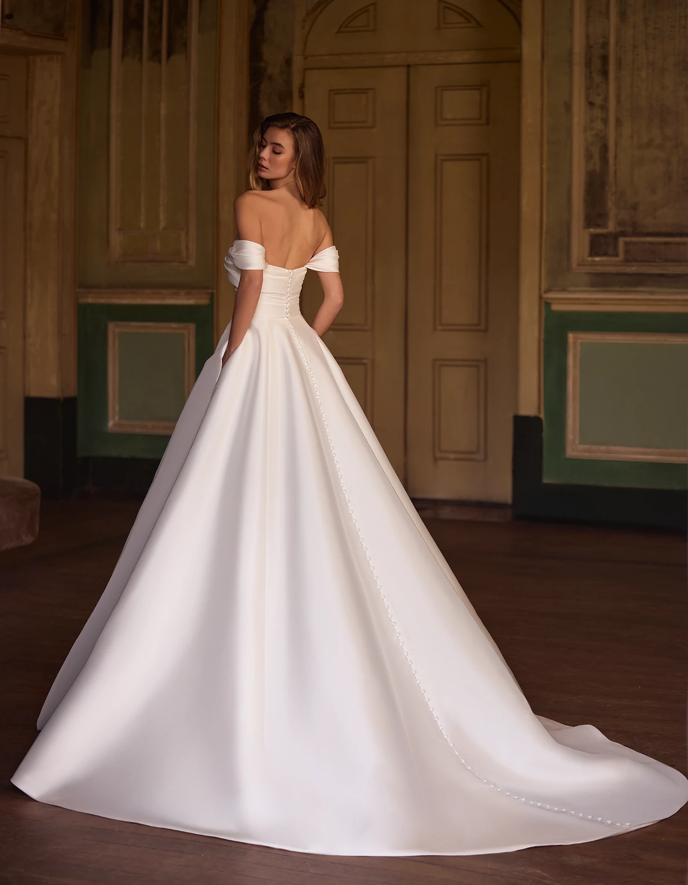 Cette robe de mariée princesse moderne, entièrement confectionnée en mikado, allie sophistication et audace. Son corsage délicatement drapé, associé à un décolleté en cœur et un dos nu, crée une silhouette à la fois élégante et sensuelle. Les manches tombantes amovibles ajoutent une dimension unique, offrant à la mariée la possibilité de varier son look tout au long de la journée. Un modèle exceptionnel pour celles qui souhaitent allier modernité, raffinement et polyvalence.