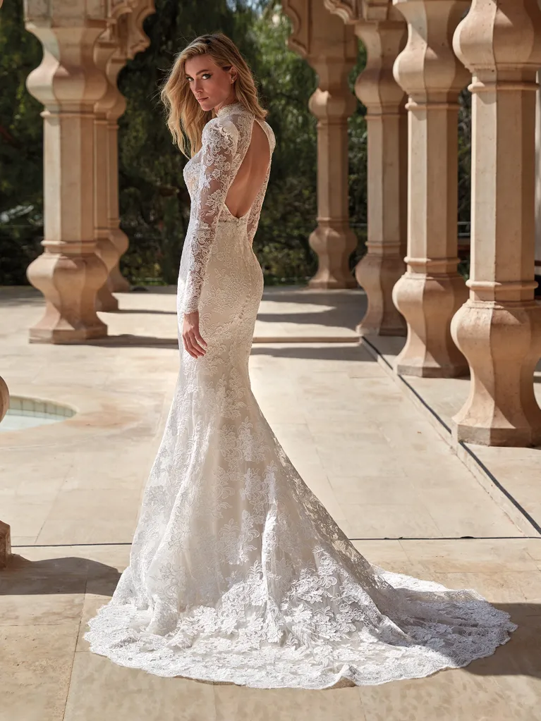 Plongez dans l’univers enchanteur de la robe LOIRE pour un look sophistiqué et moderne. Toute en modestie avec son dos ouvert en goutte de dos et son col haut, la robe possède aussi des détails comme sa forme ou la dentelle en transparence plus sensuels.